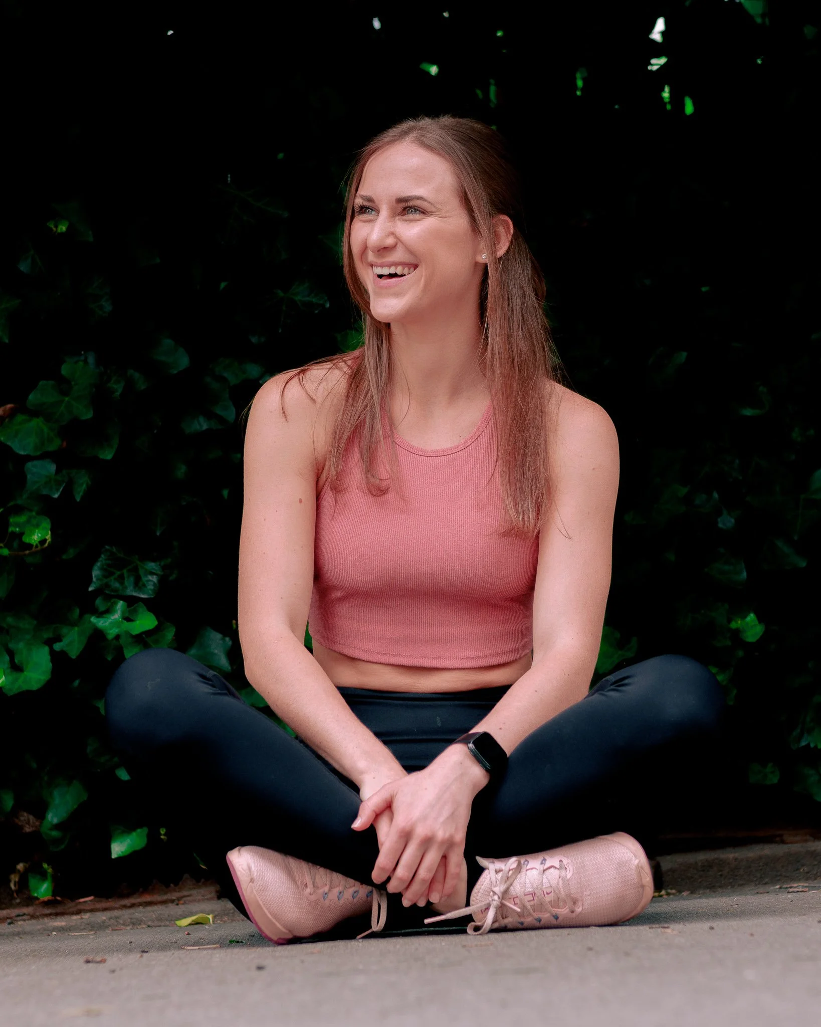 Young woman sitting on the ground, smiling, wearing a pink athletic top, black leggings, pink sneakers, and a fitness tracker, with green foliage in the background.